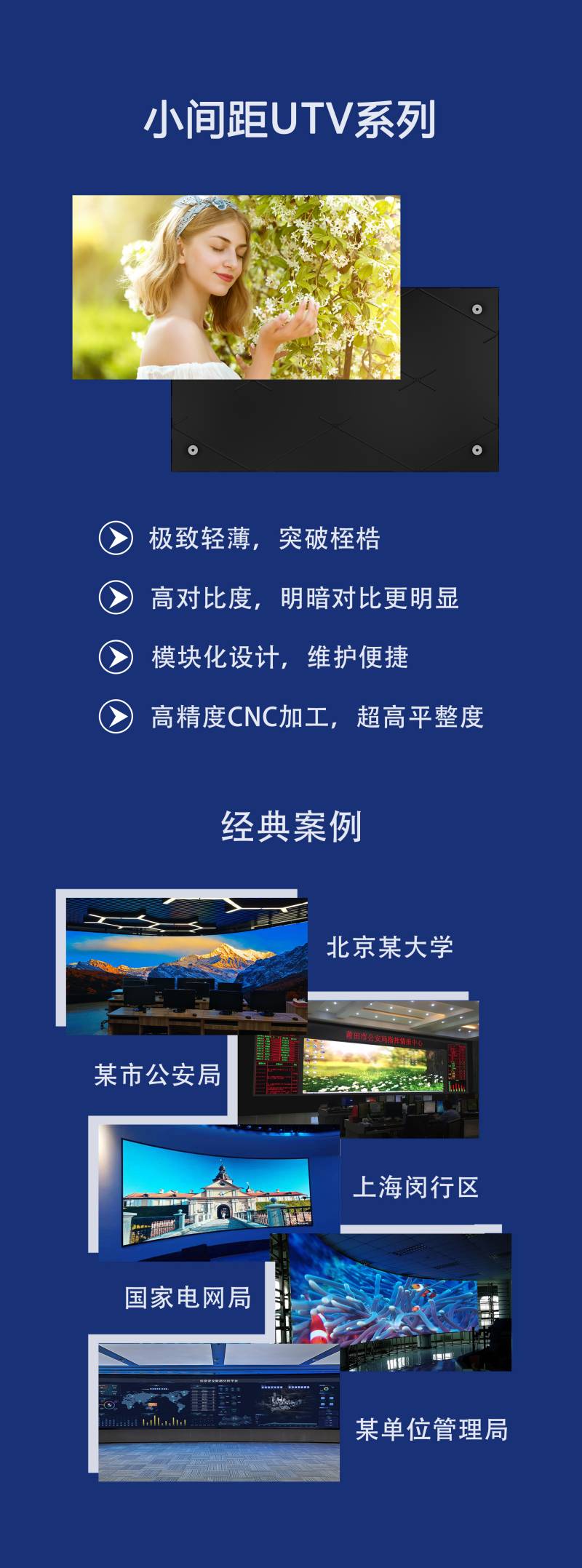 mile米乐光电旗下当家小间距产品——UTV系列,运用“超薄”设计理念,单个箱体仅重4.5㎏,厚度仅25mm,采用全前安装及维护,高效便捷,并运用独特的隐藏式无线设计,具有高平整度、低功耗、高亮度、宽色域等特点,先后获得3C、CE、CB、ETL、FCC、RoHS等认证。